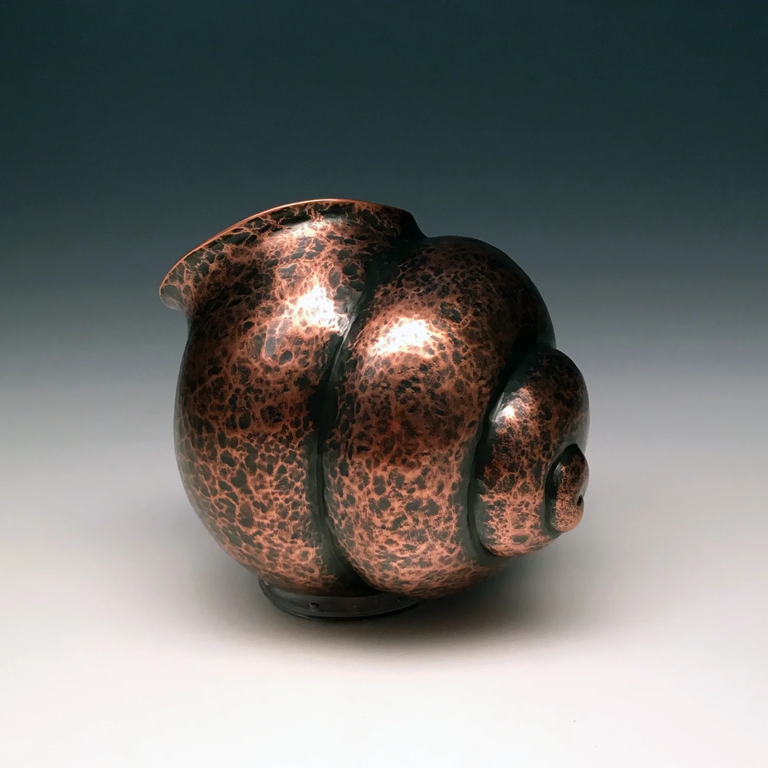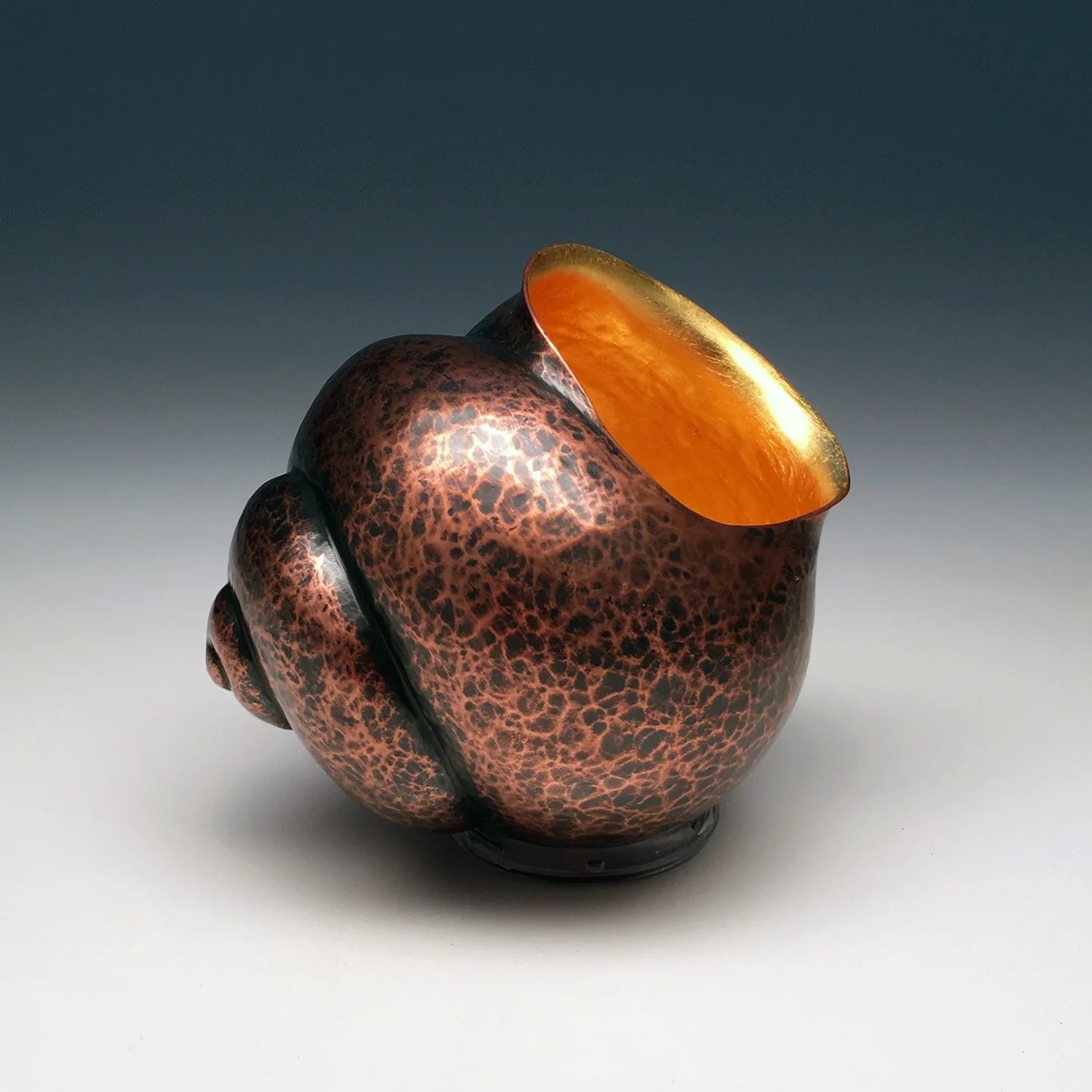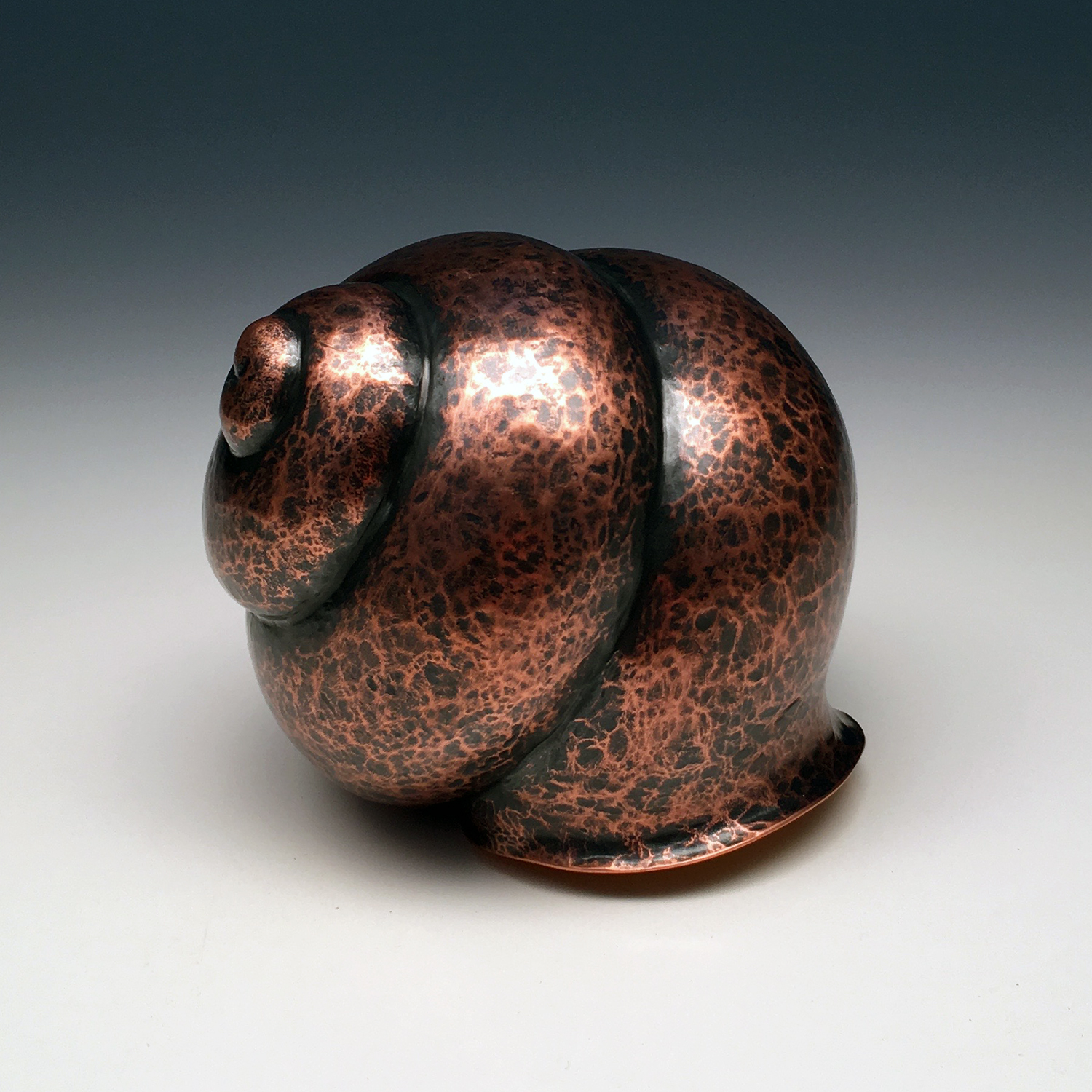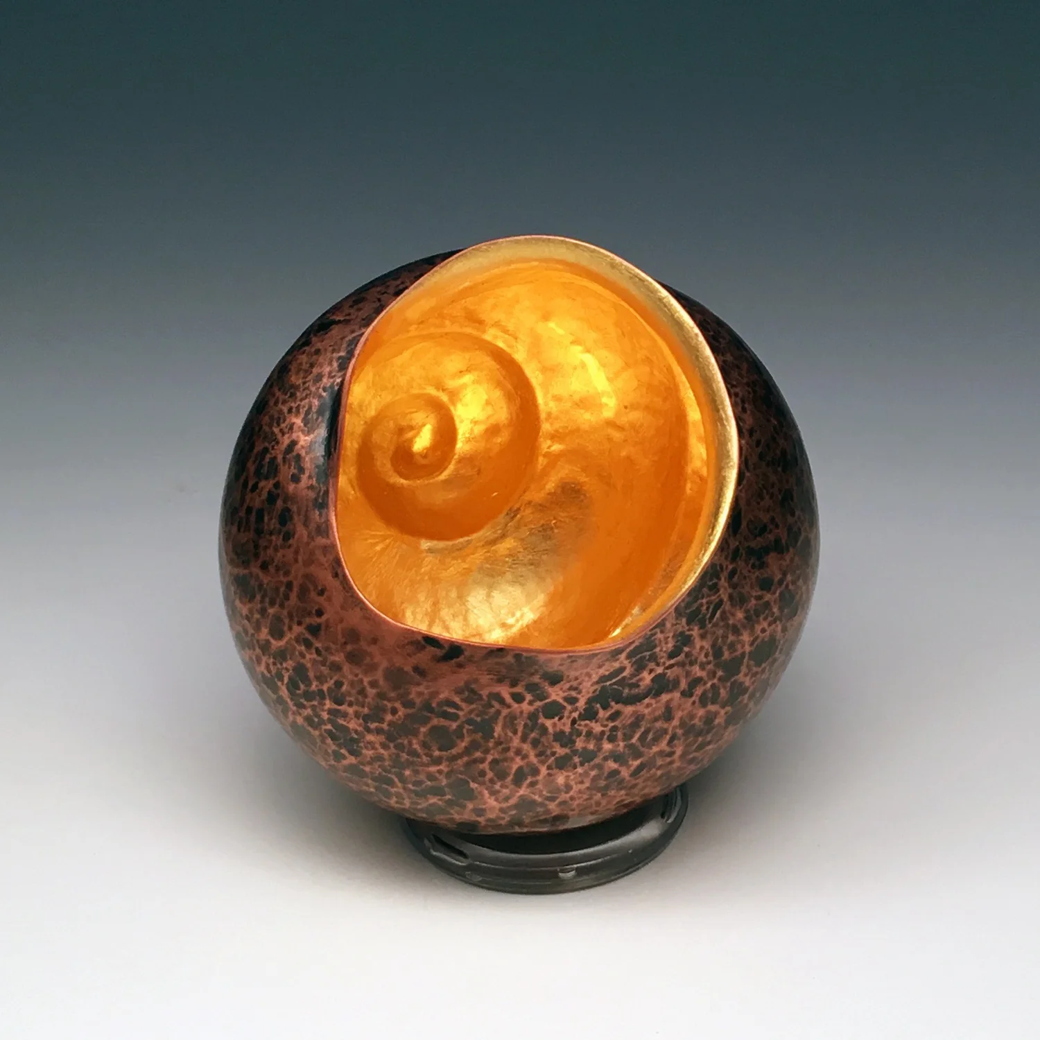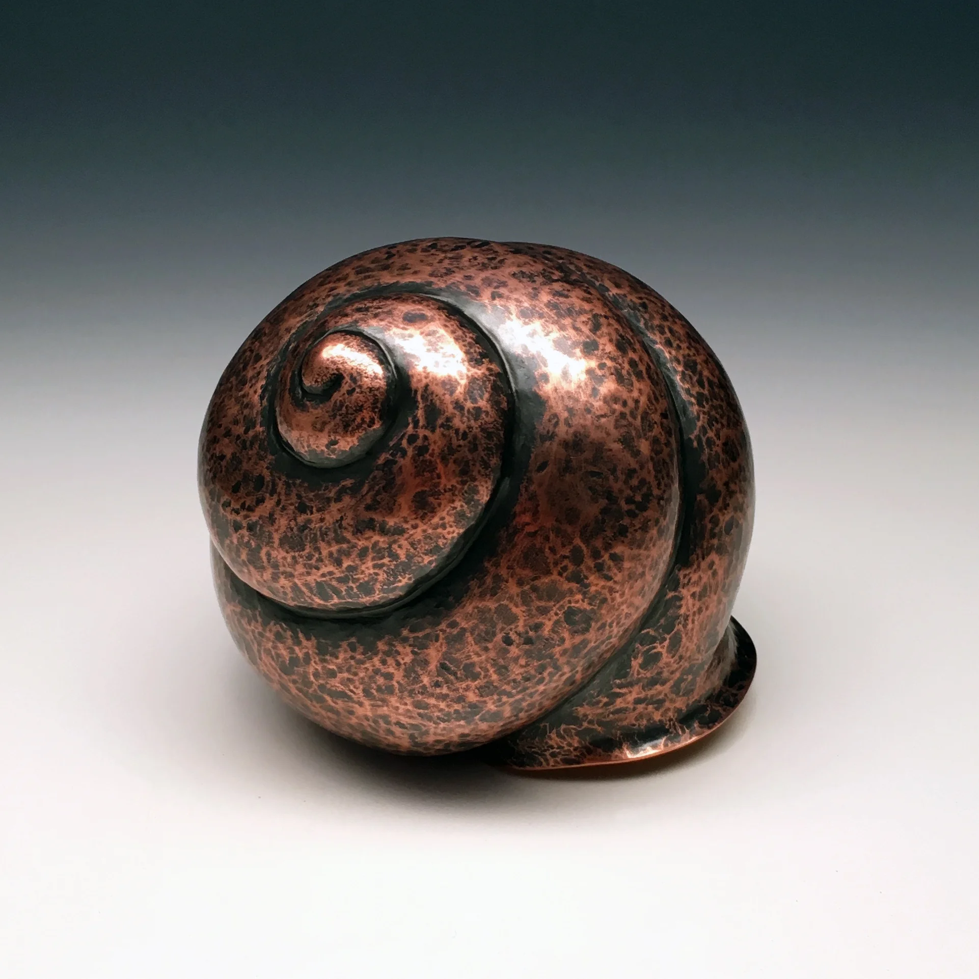 This copper sculpture was raised and hammer chased in the style of a common garden snail. The interior of this shell is gilded with 23K gold leaf. This sculpture is approximately 4" wide and 3" tall.